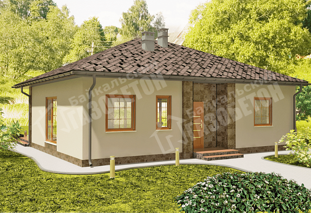 Одноэтажный дом с интересной планировкой. Рассчитан на большую семью с детьми, три спальных комнаты, гостиная, объединенная с кухней. Из гостиной предусмотрен выход на террасу.